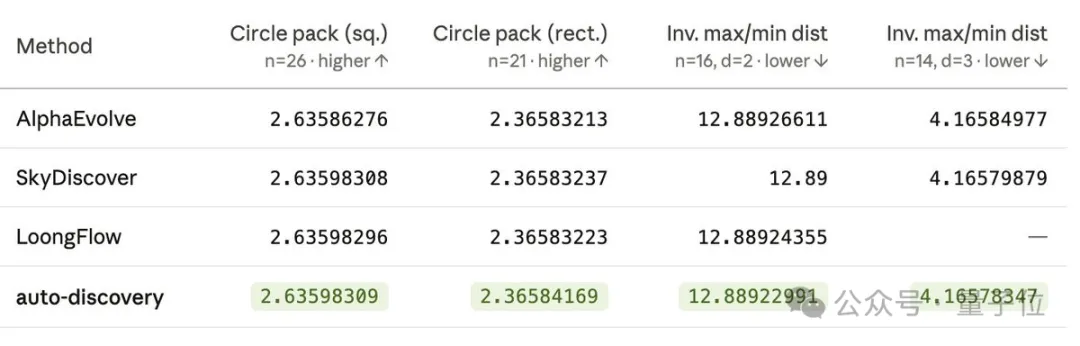 在几个经典的数学优化任务上竟然比AlphaEvolve、SkyDiscover和LoongFlow等重量级的结果更好。