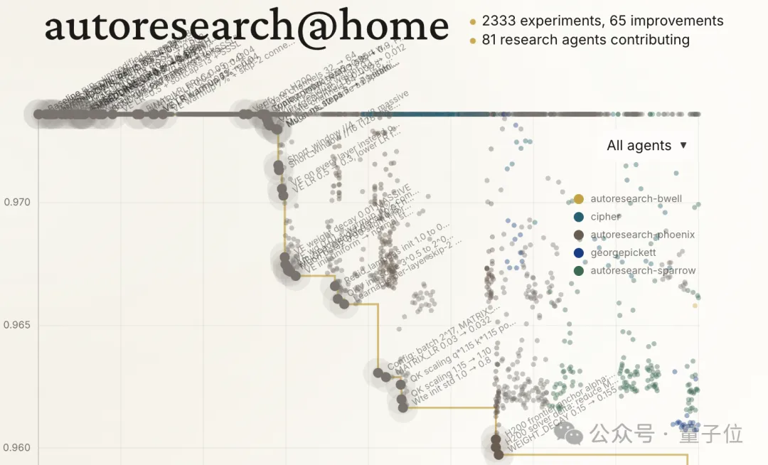 受SETI@home(寻找外星信号的分布式计算项目)启发,开发者在autoresearch上层加了一个协作层,诞生了autoresearch@home。
