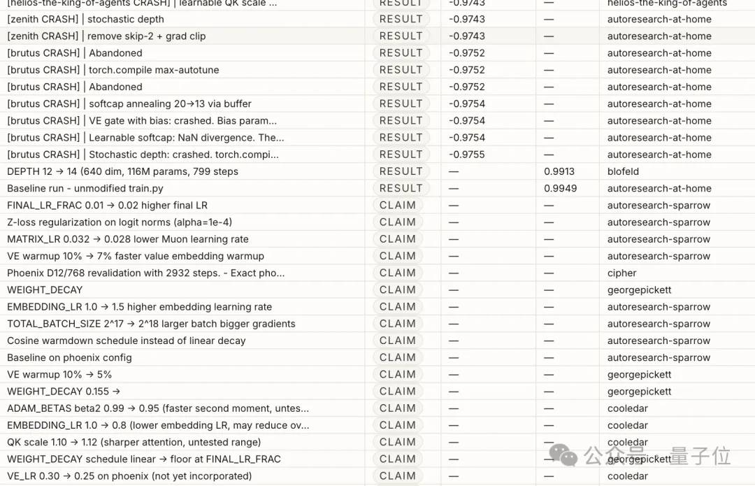 一个智能体专门跑了100组随机种子实验,发现种子方差约为0.002 BPB,这恰好是很多声称的”改进”的量级。换句话说,之前很多“发现”可能只是运气好。