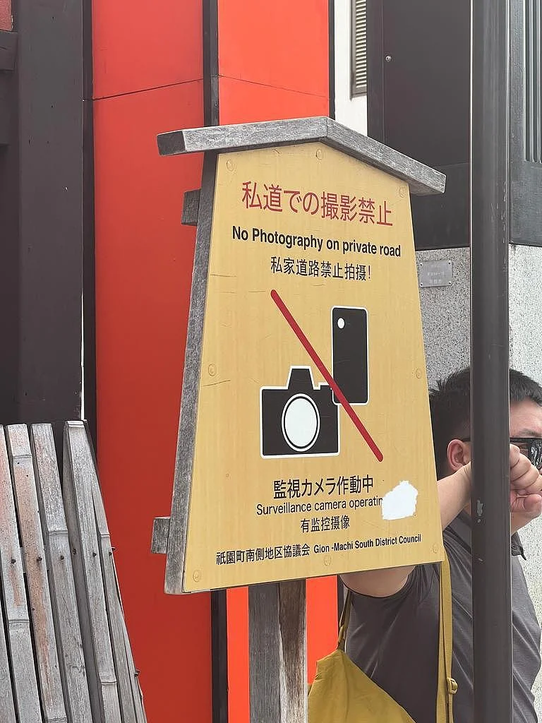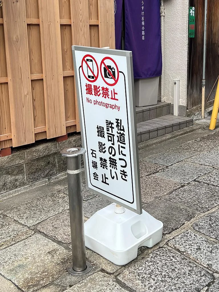 许多游客并未意识到,京都的道路有公私之分。由于经常发生游客闯入私人领地拍照、滋扰艺伎及舞妓(maiko)的事件,祇园(Gion)地区的部分小巷已明令禁止摄影,违者将被警告。