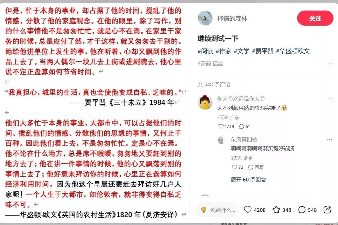 此后,“抒情的森林”利用查重软件和电子书网站,发现更多中国作家的作品有“异曲同工之妙”,他将这些疑似抄袭的文本通过红色字体标注出来并进行对比展示,持续在社媒上更新发布,引起网民热烈回响,不仅吸引数万人追踪关注,还被外界形容是“文学圈纪检委”。