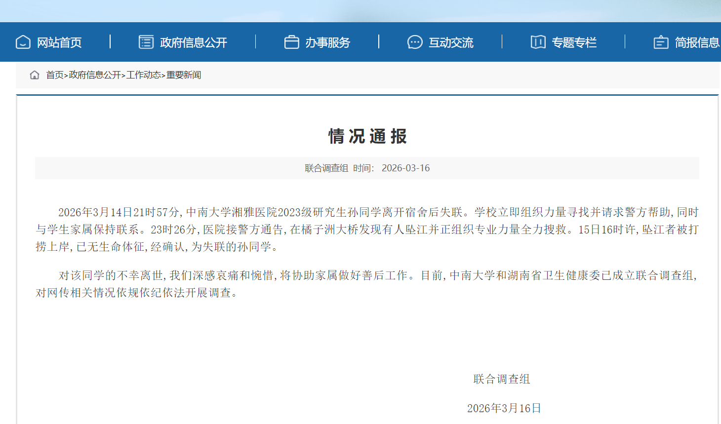 2026年3月14日21时57分,中南大学湘雅医院2023级研究生孙同学离开宿舍后失联。学校立即组织力量寻找并请求警方帮助,同时与学生家属保持联系。23时26分,医院接警方通告,在橘子洲大桥发现有人坠江并正组织专业力量全力搜救。15日16时许,坠江者被打捞上岸,已无生命体征,经确认,为失联的孙同学。