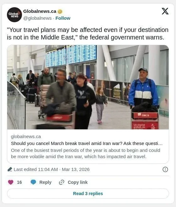 加拿大政府在战争爆发后已发出旅行警告,提醒公众关注航班和空域情况。