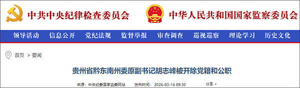 据贵州省纪委监委消息:经贵州省委批准,贵州省纪委监委对贵州省黔东南州委原副书记胡志峰严重违纪违法问题进行了立案审查调查。