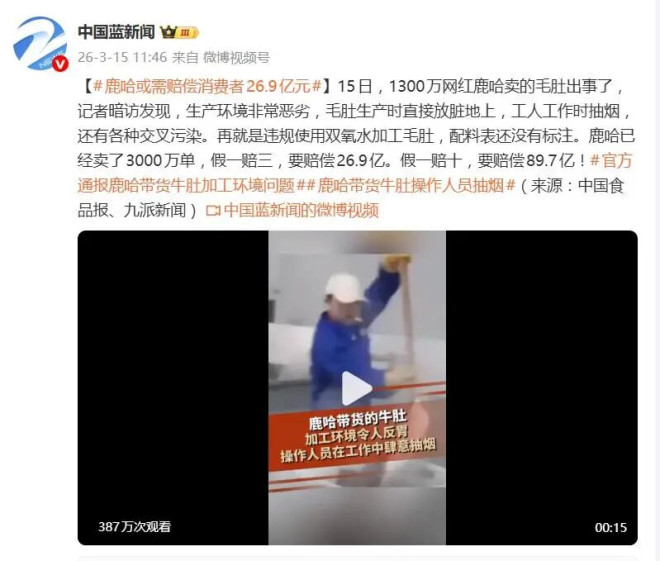 一边是工厂如此不堪的生产实况,另一边却是鹿哈直播间里信誓旦旦的“免洗免煮、假一赔十”的承诺。巨大的反差,如今正化作一柄沉重的达摩克利斯之剑。数据显示,该产品单平台销量已近3000万单,单价约29.9元。若按直播间“假一赔三”的承诺,赔付金额将高达26.9亿元;而若依据《食品安全法》的“退一赔十”标准,这个数字将飙升至令人瞠目的89.7亿元。