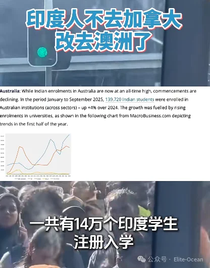 再看澳洲。2025年,澳洲一共有14万印度学生注册入学。这个数字比加拿大整整多了14倍!