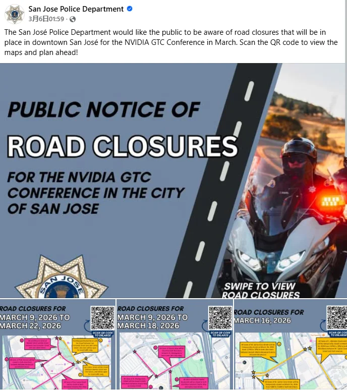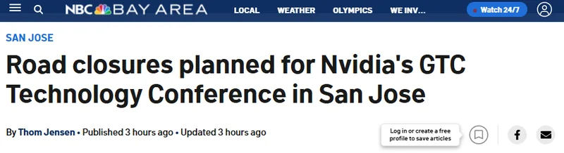 英伟达在圣荷西思爱普中心(SAP Center)附近举办的GTC技术大会预计将吸引超过3万名参与者。为期一周的活动期间,一些道路已经封闭,而且还有更多路段计划进行封闭。