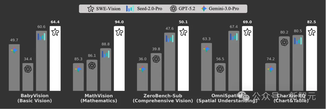 其结果令人瞩目:在五个不同的视觉基准测试中——涵盖基础感知、图表推理、数学问题解决、空间理解和复杂的多步骤视觉挑战——SWE-Vision始终改进了前沿LLM,如GPT-5.2-xhigh和Seed-2.0-Pro,并取得了最先进的结果:
