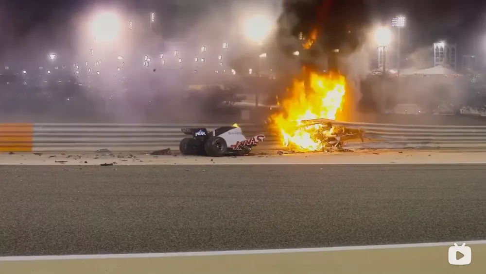 在2020年的巴林大奖赛,哈斯车队的车手罗曼·格罗斯让在赛道上遭遇了严重事故,这场事故被完整剪进了《极速求生》,变成了一段险象环生、惊心动魄的影像。
