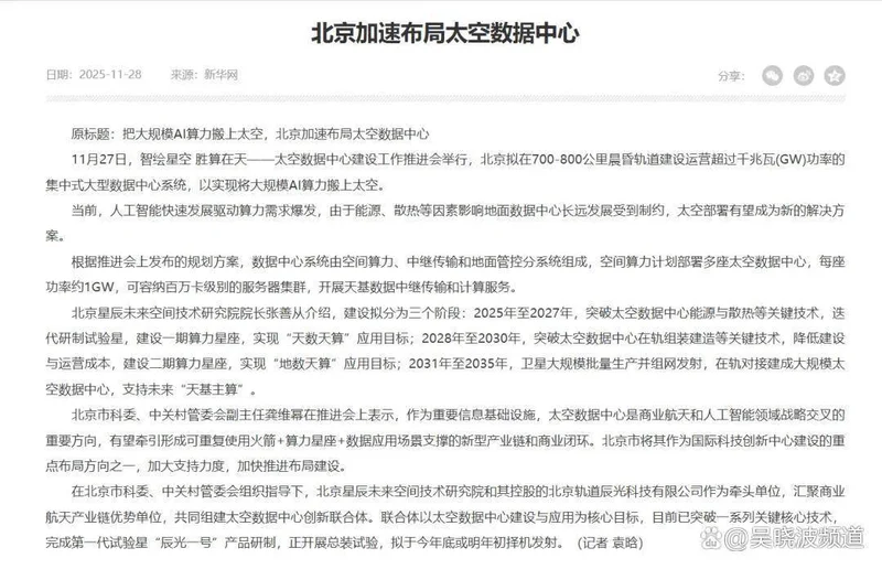 我国也没有落下。2025年底,北京市科委、中关村管委会等部门在太空数据中心建设工作推进会上提出, 我国要加速布局太空数据中心新赛道,在距地约700—800公里的晨昏轨道上,建设运营超过千兆瓦功率的集中式大型太空数据中心,把大规模AI算力搬上太空。