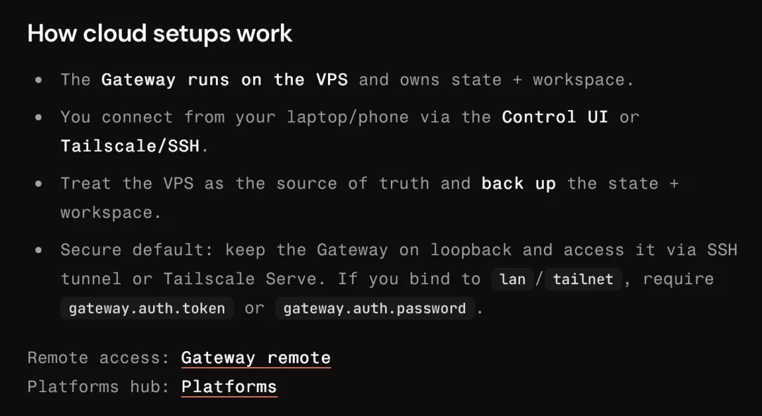 实际上,OpenClaw 的设计者从一开始也并没有把固定在单机本地视作唯一,也提供安装到远端VPS的模式。