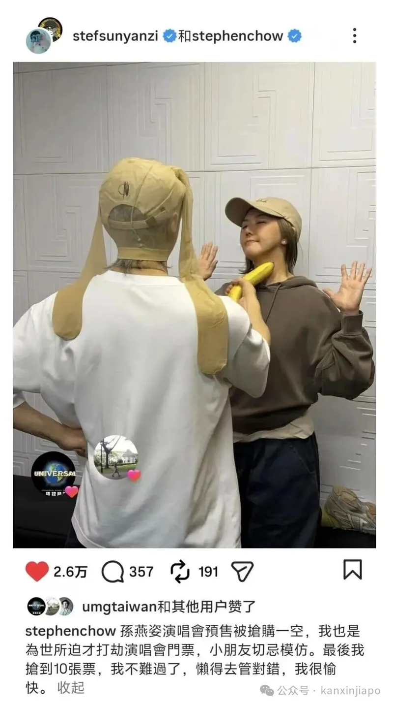 3月13日及15日,新加坡歌手孙燕姿在香港举办演唱会,门票开卖即秒杀,天后魅力势不可挡。就在演唱会前夕,她却遇上“喜剧之王”周星驰的“持蕉行劫”要演唱会门票,画面曝光后笑翻全网。