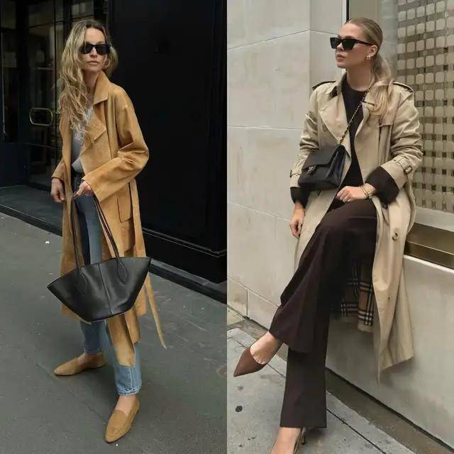 风衣外套垂坠感好,穿在身上特别修饰身形,搭配一条牛仔裤或者是西装直筒裤,脚上踩了一双浅口单鞋乐福鞋。身材线条感就变得很流畅。使得穿搭者的身材比例高挑纤瘦。