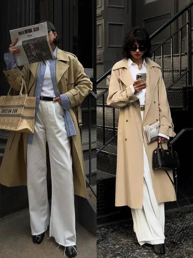 Tips③:卡其色风衣+白色直筒阔腿裤