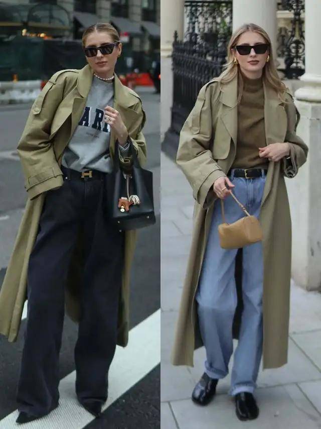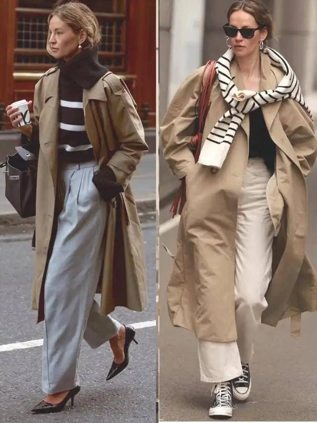例如上面穿的同样是卡其色的风衣外套,换一条裤子便是另一种气质与风格。