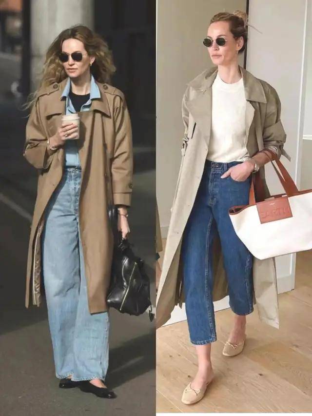 咱们就看上面这两套穿搭示范,蓝色牛仔直筒阔腿裤配上黑色玛丽珍鞋,叠穿蓝衬衫和黑 T 恤,外搭卡其色风衣,呈现效果慵懒随性。