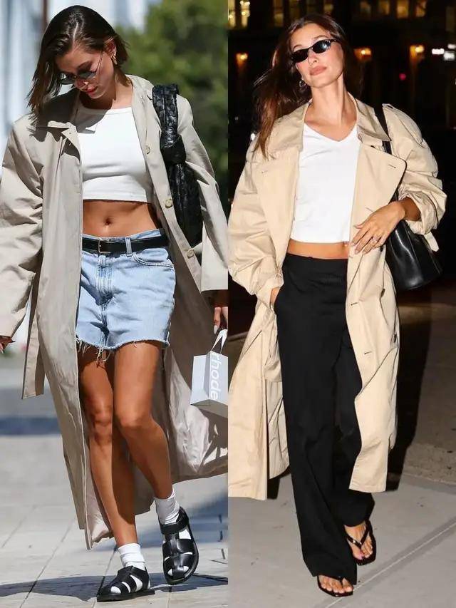 若是有胯宽腿粗这样的身材小缺陷,就选择一条黑色直筒裤配上风衣外套,内搭短款白 T 恤,同样露腰穿搭,但可以悄悄地藏住身材缺陷和小困惑,使得自己看起来显瘦。