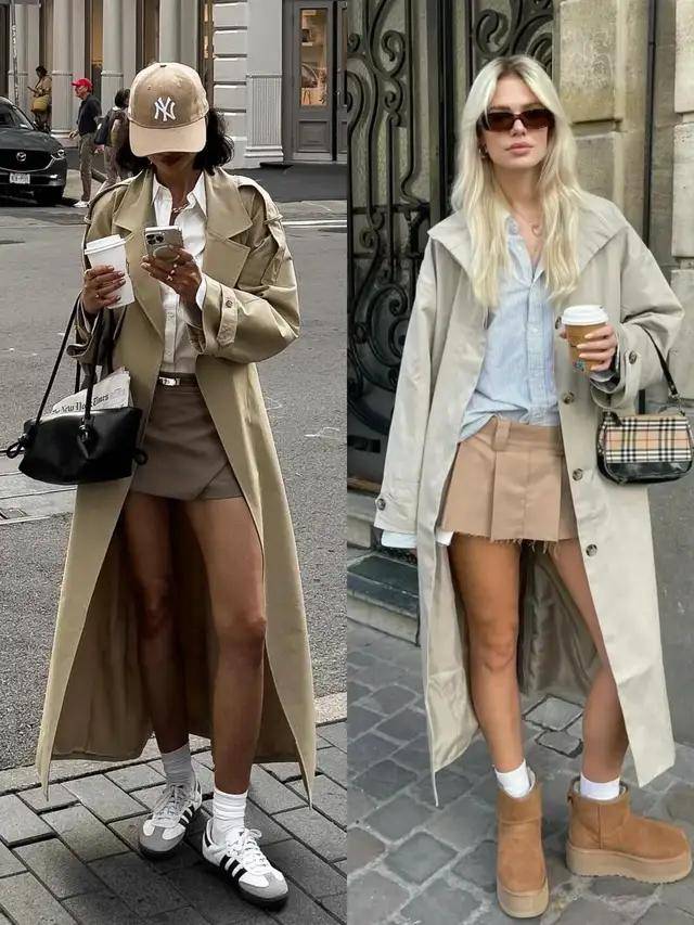 天气回暖,想呈现自己的好身形,试试下衣失踪穿搭方案,选择一件卡其色的风衣外套,内搭白衬衫,配上同色系的短裙,脚踩经典款式的德训鞋,利落显腿长。