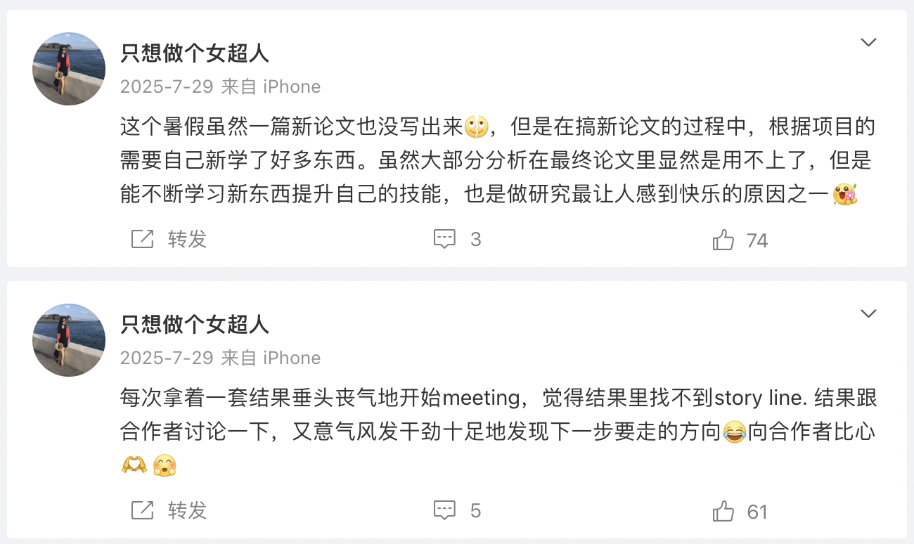 读博无疑是一个自我和解和打怪升级的过程,其间能够培养可转移技能和非认知能力,如坚持和反思能力。我花了很长的时间想通,即使最终未达到预期目标,过程中所有的努力也会带来自我赋能和成长,一定不会白费。