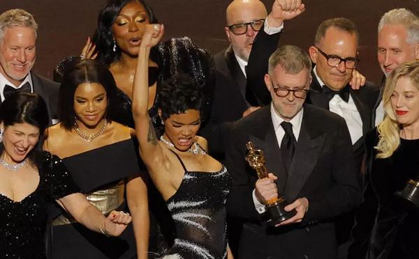 Le réalisateur Paul Thomas Anderson et l'équipe du film célèbrent leur victoire à l'Oscar du meilleur film pour « Une bataille après l'autre » lors de la 98e cérémonie des Oscars à Los Angeles, États-Unis, le 15 mars 2026. © Mike Blake / REUTERS