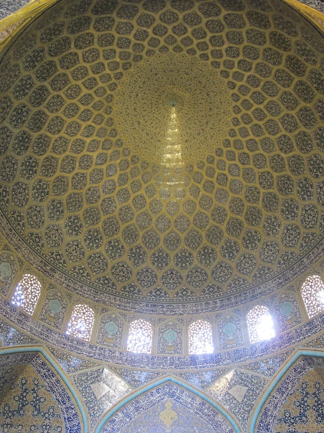王家清真寺穹顶内部。当年的设计师巧妙地在入口方位设置了一扇窗,让阳光在特定时刻直接射到穹顶上,形成孔雀开屏的视觉效果。