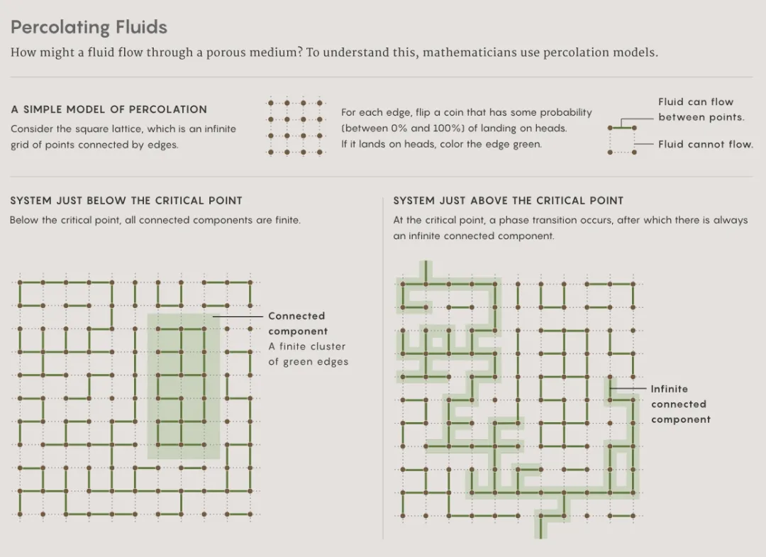 要理解数学渗透,想象一个由边连接点形成的无限网格,构成棋盘状。对每条可能的边,抛掷一枚有偏差的硬币。如果正面朝上——根据硬币的偏差,概率可能是1%、20%或80%——将边涂成黑色。否则,就留着。(在物理渗透中,黑色边意味着流体可以流过系统的该部分。)数学家想要理解连通的黑色边簇,即所谓的连通分支,是如何在原始格点上形成的。