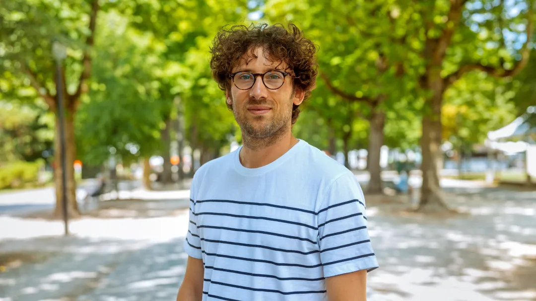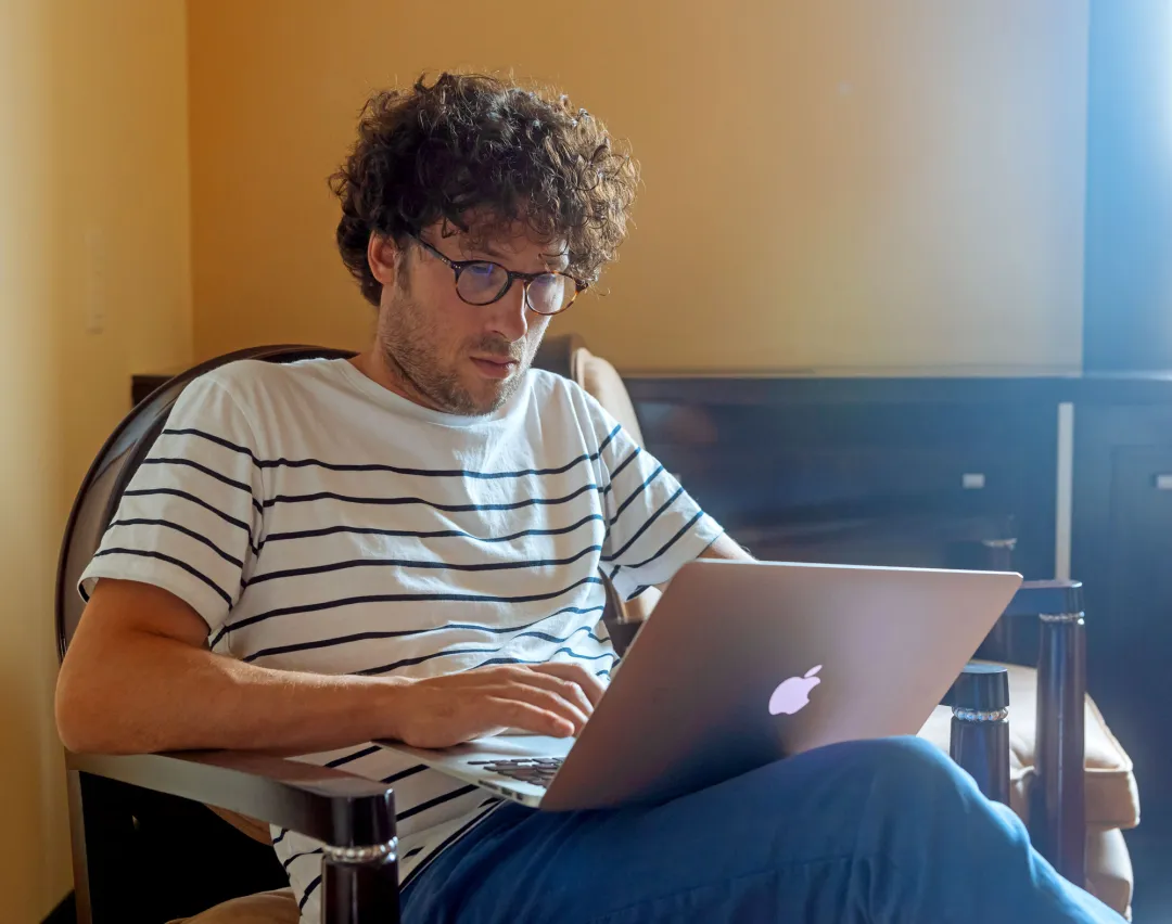 Hugo Duminil-Copin坐在椅子上,腿上放着笔记本电脑。
