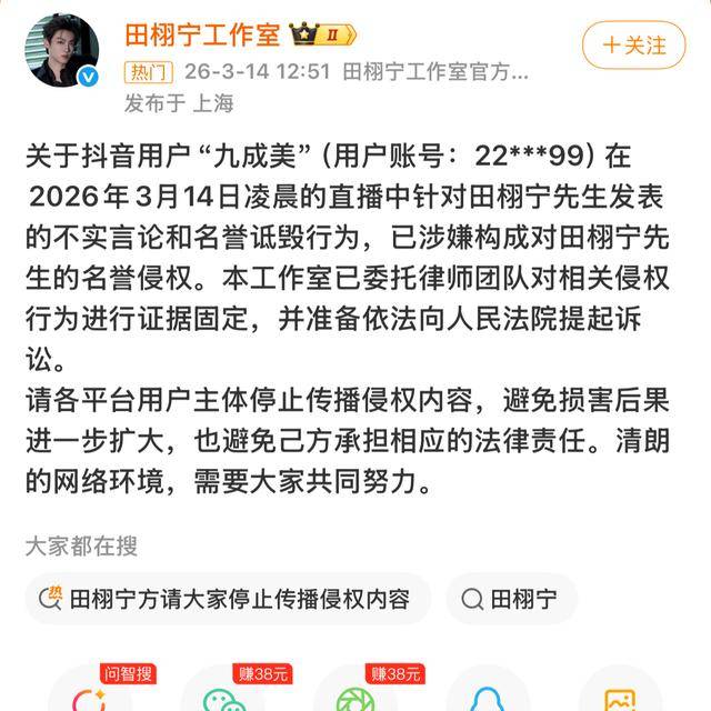 田栩宁工作室发声明,表示九成美说的是不实的,还表示要起诉她。