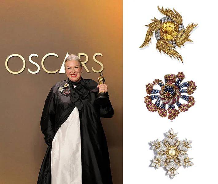 值得一提的是,凭借该片斩获最佳服装设计大奖的凯特·霍利登台领奖时,同样佩戴了三枚Tiffany古董胸针,它们均来自蒂芙尼古董珍藏库让·史隆伯杰的作品——奖杯和胸针出自同一个夜晚。极致的美,经得住时间检验~