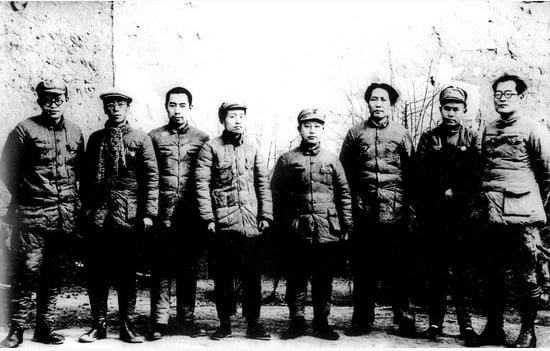 1937年12月,中共中央在延安召开政治局会议。图为出席会议的部分人员合影。左起:张闻天、康生、周恩来、凯丰、王明、毛泽东、任弼时、张国焘。(图片来源:公有领域)