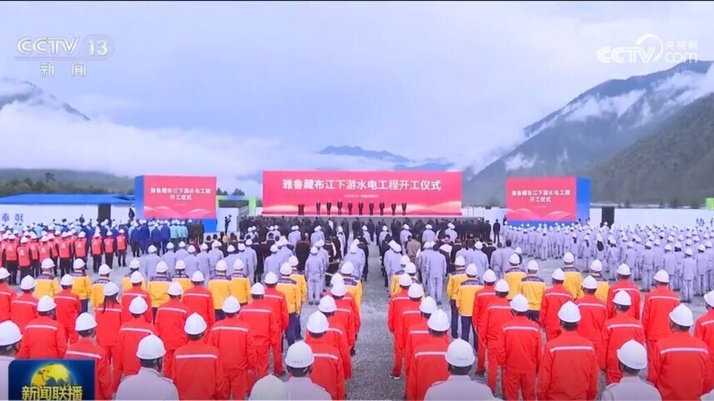 图1:2025年7月19日雅鲁藏布江下游水电工程正式开工,但是开工仪式是在另一个水库大坝——米林水电站的坝址处举行的, © 图片来源:网络截屏