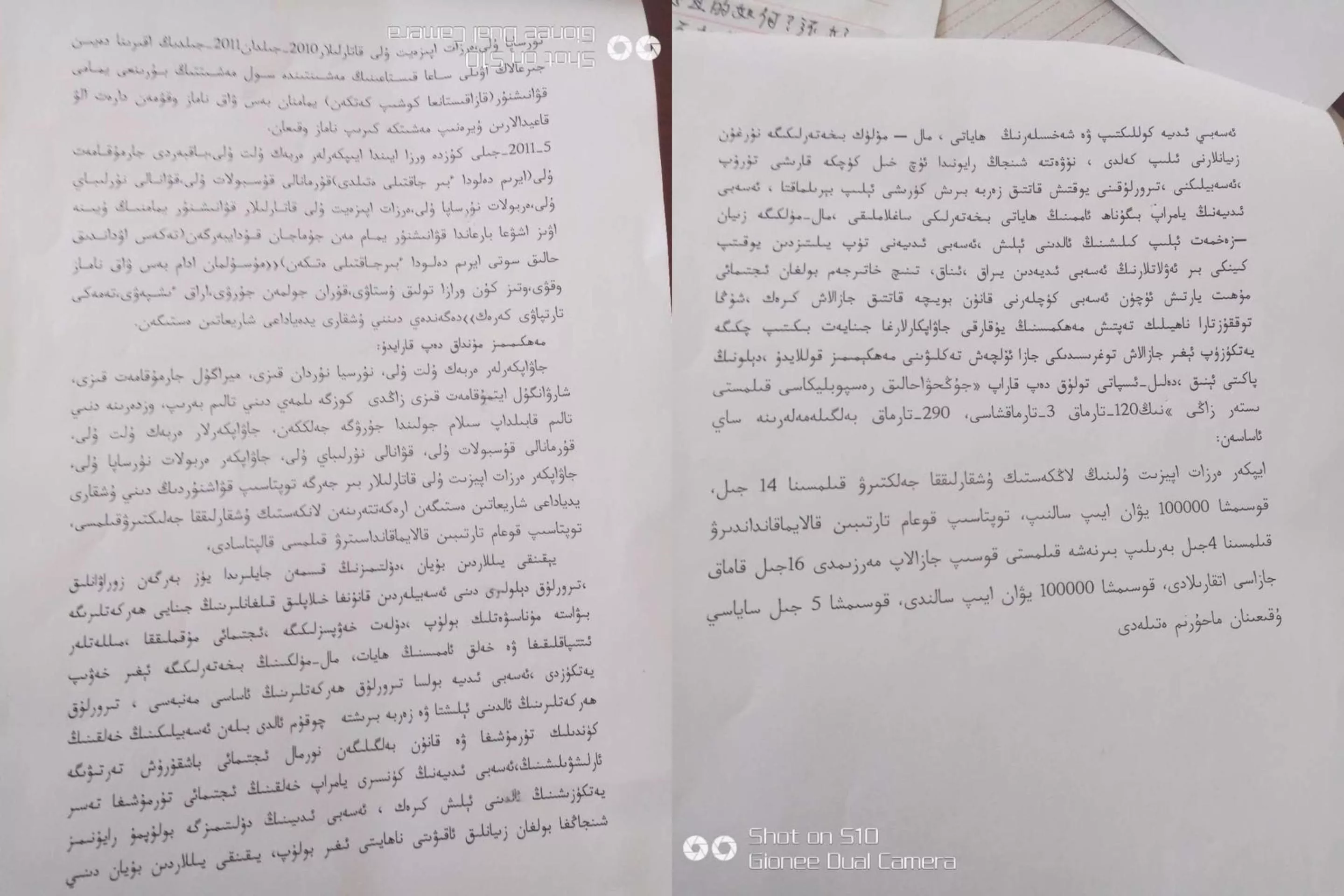 该组织创办人赛尔克坚在接受本台采访时透露,他的线人近期从新疆当地冒着巨大风险偷拍并传出一批判决书、刑事拘留通知书及检察院批捕文件。文件中记录了被捕者的姓名、住址和案件情况。