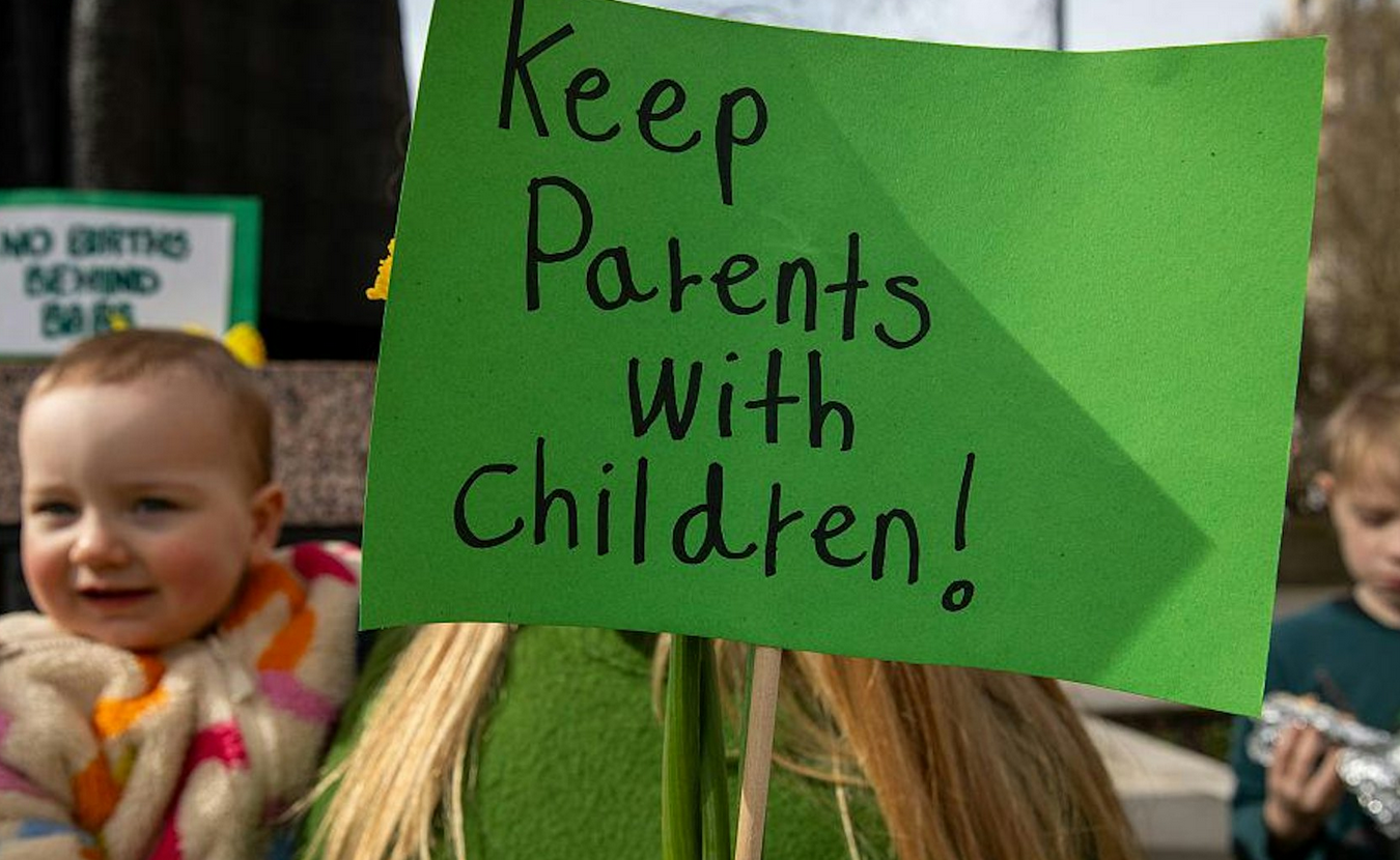 2026年3月14日,一位带着婴儿的母亲在伦敦举着「让父母与孩子同行」的标语牌。(资料图片,Reuters)