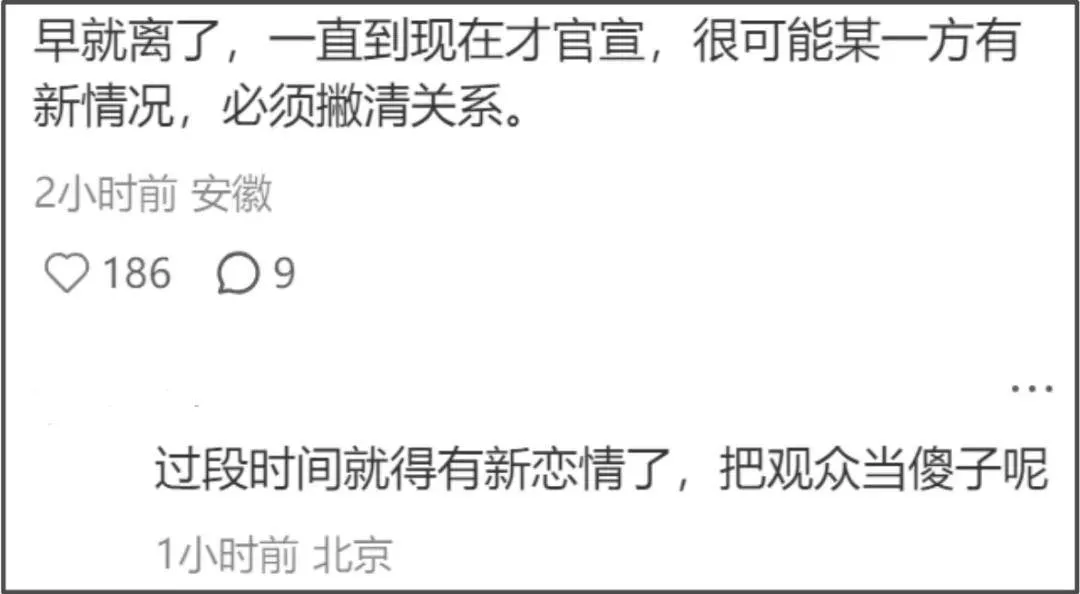只是不知道是不是因为贵圈太乱太出名,网友对任何明星的声明都将信将疑,尤其是这个时间点官宣,都质疑是不是有一方被拍到新恋情或者想要官宣了,才选择公开声明。