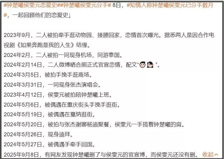 再来就是和33岁女星钟楚曦的恋情了,二人2023年被拍,2024年官宣,2025年分手,恋爱时间不算长,但网友的爆料刚刚好发生在两年时间内。