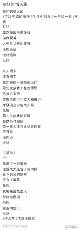 在3月15日,林有慧在社交平台晒出两人一起过白色情人节的画面,没有孩子的两人养了一条小狗,两人都是精致的仪式感家族,所以不管是什么节日都很喜欢庆祝一下,碎碎念的发文也挺温馨的,起床一起去店里拿表无意发现白色情人节。
