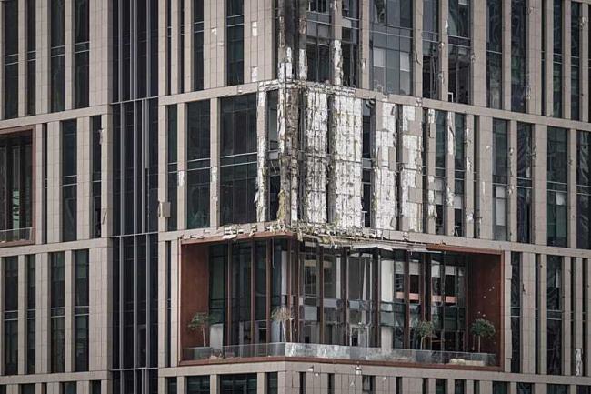 上图为阿联酋的商务大楼被伊朗无人机袭击后,外墙破损。