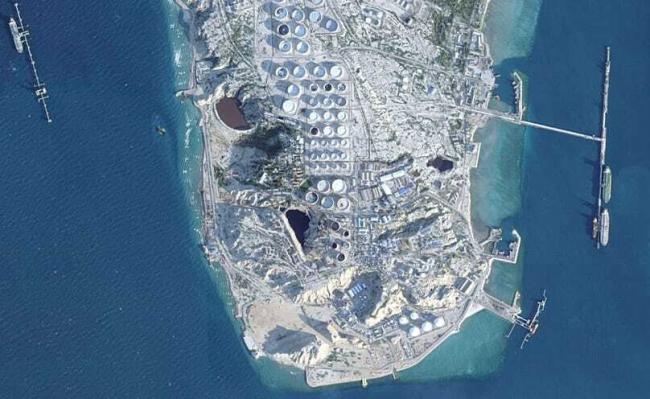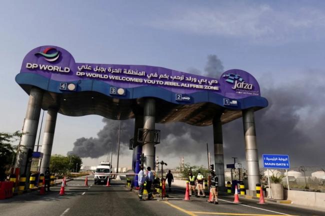 上图为伊朗的无人机袭击后,阿联酋的杰贝阿里港冒烟。