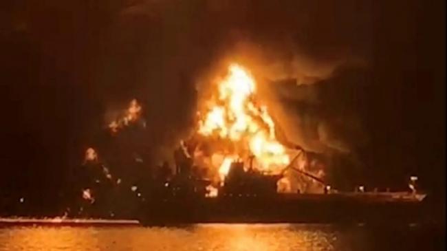 上图为伊朗海上无人机袭击一艘商船,导致船体爆炸燃烧。