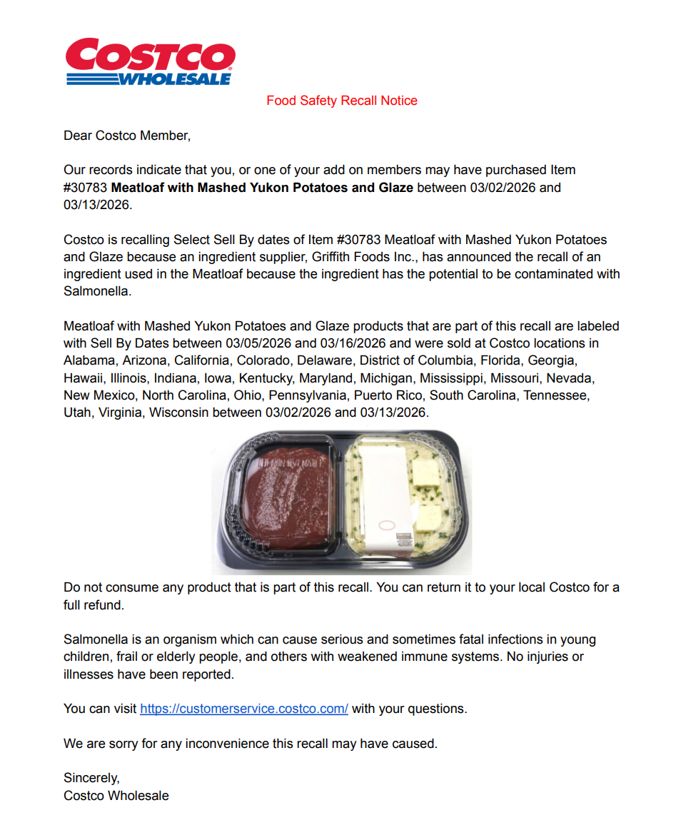 Costco表示,消费者可能在3月2日至3月13日期间购买了这些产品。