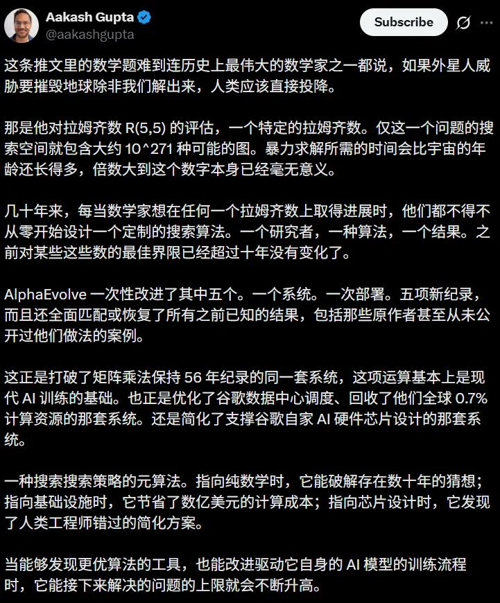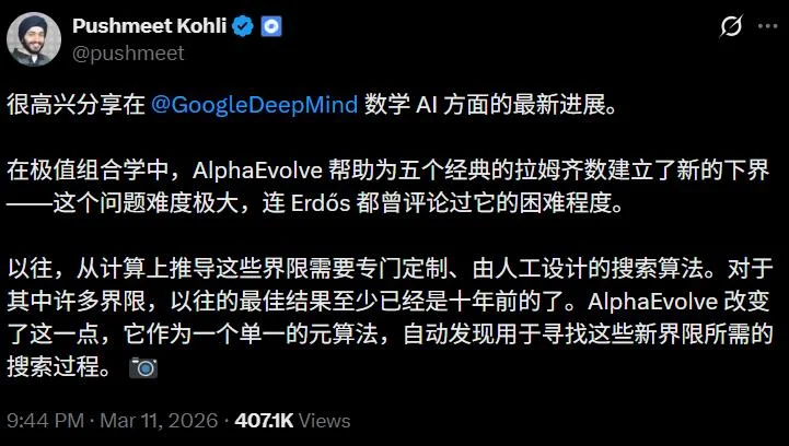 DeepMind研究者报喜后,CEO Hassabis也火速转发庆贺。他表示,AlphaEvolve的这项成果,是AI在数学领域的又一个重大里程碑!