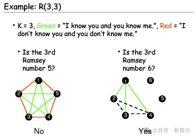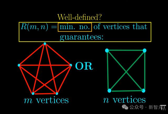 存在r个顶点的完全子图(clique)或存在s个顶点的独立集(independent set)比如,R(3,3) = 6。
