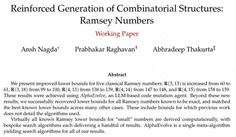 就在刚刚,谷歌DeepMind又出神功了。他们开发的系统AlphaEvolve,在极值组合学问题上取得突破,一次性改进了五个经典拉姆齐数的下界!