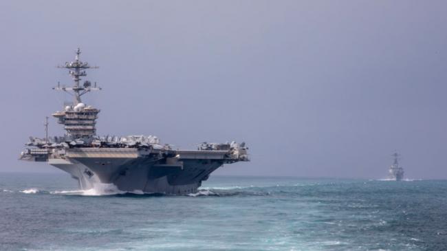 2024年8月15日,美军航母林肯号(CVN 72)和驱逐舰彼得森号(DDG 121)穿越新加坡海峡。(美国海军)