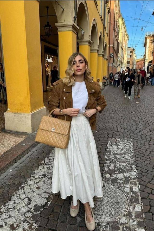 棉质伞裙挺阔有型,搭配棕色正肩夹克外套,又美又飒,有种不费力的时髦感。