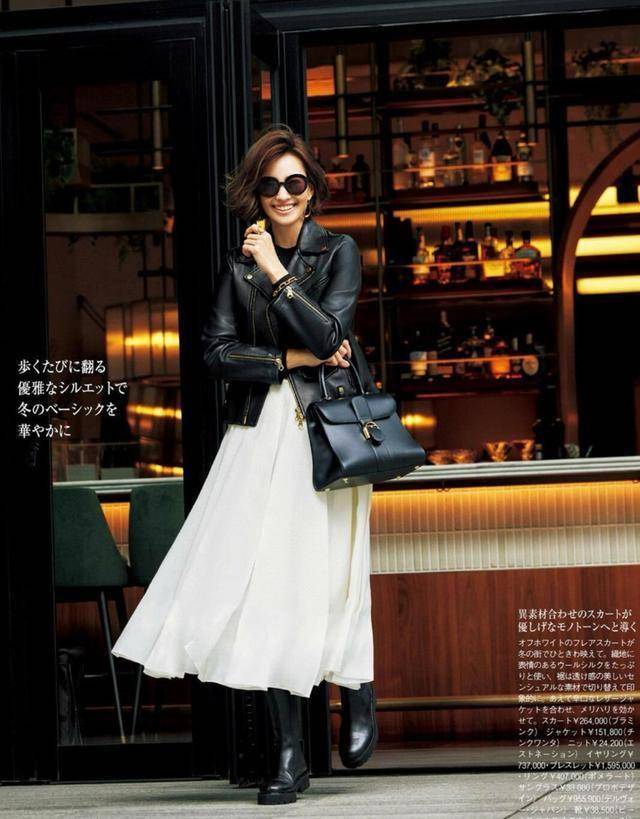 每个人的衣橱里都有一件皮外套,但不要再配小黑裤了,阔摆小白裙才是“最佳拍档”,配双黑色长靴,超有范儿!