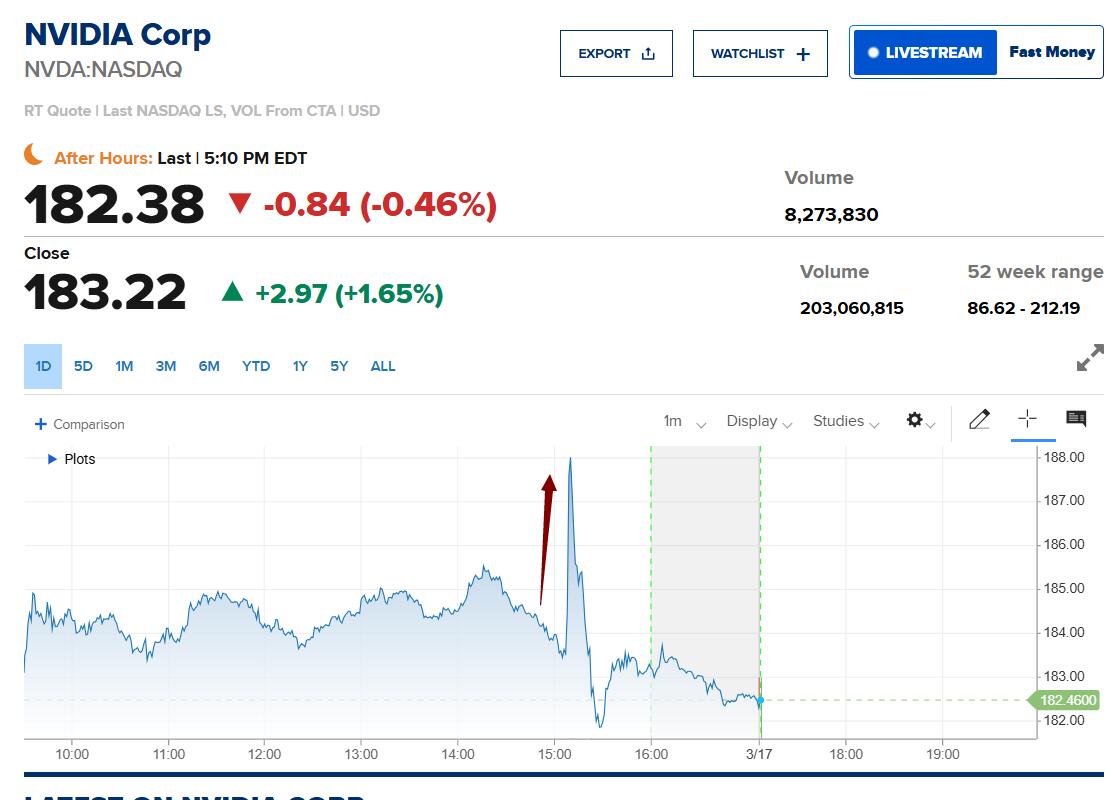 黄仁勋公布上述1万亿美元的预测后,周一美股午盘时段,英伟达股价涨幅迅速扩大、刷新日高,日内涨约4.8%,后很快回吐过半涨幅,到收盘时涨不足2%。在此之前,截至上周五收盘,英伟达股价进入2026年以来已累跌超3%,市场对AI投资周期持续性的担忧一度令股价承压。