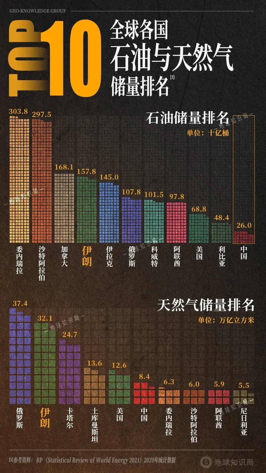 而我们中国的石油储量只有约260亿桶,仅为伊朗的16.5%;天然气储量约8.4万亿立方米,仅为伊朗的26.2%。伊朗的油气资源相当于5-6个中国的体量。