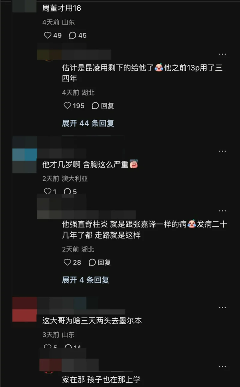 不过,也有网民将焦点放在周杰伦僵硬的走姿上,直言:「他才几岁啊 含胸这么严重」、「这走路的姿势」。有粉丝则回答解释这与周杰伦患有强直脊柱炎有关,发病了走路就是这样。周杰伦早在18岁时因家族遗传,而患上强直性脊椎炎。曾有报道指,若他在演唱会期间病发,或需服12粒止痛药才能止痛;更有指他曾在参加篮球比赛前病发要打针食药,痛得由妈妈帮忙穿袜子。好朋友刘畊宏亦曾透露,自己去对方家,周杰伦由房间走到门口十米距离竟要花上10多分钟。然而,周杰伦即使有健身,仍无法提重物,走路姿势亦会受影响。难怪有粉丝留言心疼偶像又要写歌又要忍受病痛,故再也不催对方出歌了。