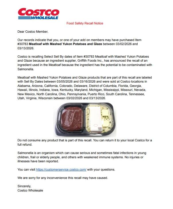 美式大卖场Costco宣布,已在超过美国26个州的门市召回热销的预制餐盒-「肉饼搭配马铃薯泥与酱汁(Meatloaf with Mashed Yukon Potatoes and Glaze)」,原因是餐盒中的肉饼所使用的一种食材可能受到沙门氏菌污染。